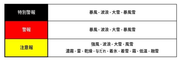 ※以下の特別警報・警報・注意報は、これまで通り発表されます。