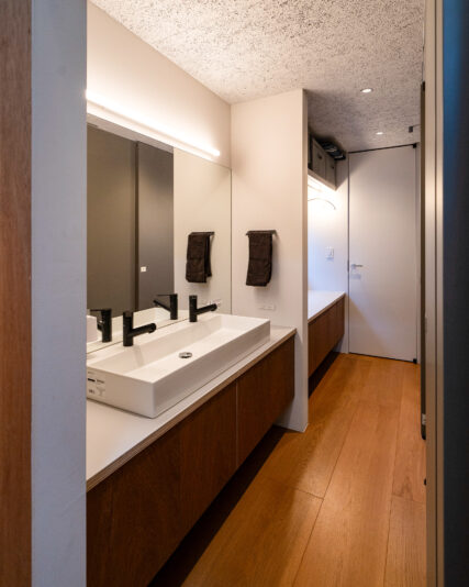 キッチンはF-FURNITURE でオーダーしたもの。長い間、湖や沼、川の底などで眠り続け、炭化が進んだオーク材である「ボグオーク」を贅沢に使った仕上げ。深い漆黒が空間のアクセントになっている。
