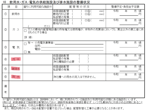 配管等の状況の項目は重要で、調査が必要です。下水道管については、対象物件の敷地内配管・前面道路配管を調査します。水道局や役所で確認し、現地と照らし合わせます。