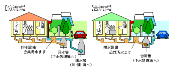 下水の集め方は2つあり、汚水(トイレ)、雑排水(風呂・台所・洗面所)、雨水の3つを一緒に流す方法を「合流式」、雨水のみ分けて流す方法を「分流式」といいます。