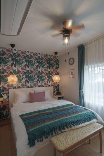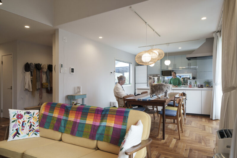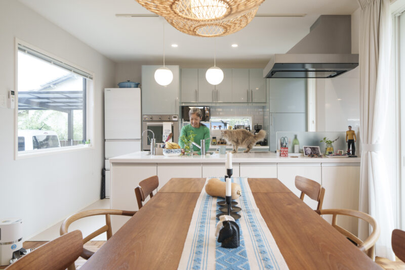 東京出身の奥さまとアメリカ出身のご主人が出逢ったのはカンボジア。日本で暮らすことにした2人が選んだのは、都内へのアクセスが良く、自然も感じられるつくば市でした。「欧米では中古住宅をリノベして住むのが主流なので、ゼロから創る注文住宅は新鮮でした。だからこそ、設計士と打合せできる FS が魅力的だったんです」とご夫妻。プライバシー重視で仕切りが多い日本の住宅とは違い、仕切りを減らして開口部を広く確保したオープンなつくりの F 邸。シンプルでナチュラルな北欧スタイルをベースに、カンボジアを彷彿させる明るい色彩をアクセントに取り入れたフリースタイルな住まいです。